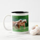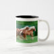 Paare Palominopferde, die in ein Rennen über einer Feld-Keramik-Kaffee-Tasse galoppieren.