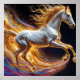 Eine atemberaubende Repräsentation eines galoppierenden Pferdes mit fließender goldener Mähne, umgeben von lebendigen abstrakten Elementen, die die Geschwindigkeit, den Power und die Schönheit der Reiteleganz und des künstlerischen Designs vermitteln.