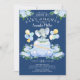Fahren Sie mit Babydusche Design mit einem niedlichen Elefanten, blauen Wagen mit Geschenken, Ballons und hübschem blauen Blume Bouquet. Dreh unsere Einladung zu einem koordinierenden Blumenbacken für eine besondere Touch.