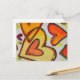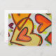 Pfirsich, Rosa und Orangenherzen kreuzen sich wie Wolken, die in einem Himmel treiben. Eine grüne Kontur verfolgt jedes Herz. Hellgelbe Farbpunkte sind wie Konfetti zwischen den Herzen. Die Aquarellmalerei hat oben eine leichte Goldschicht und rosa. Passen Sie diese Postkarte mit Ihrem persönlichen Text und Bildern an!