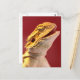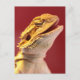 Ein bärtiger Drache, der nach oben zeigt und glücklich und fröhlich aussieht.