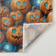 Dekorieren Sie Halloween mit spielerischem Charme mit diesem skurrilen Halloween-Wandtuch mit Kürbis, das fröhliche Jack-o'-Lantern-Kürbisse mit leuchtend blauen Augen vor einem lebendigen Nachthimmelhintergrund zeigt.