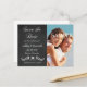 Chalkboard images are always popular, and this elegant design is no ausnahme. Your photograph (black and white or color) is on the right side, with a pretty script silver "Save the Date" on the left. Your custom text and a chalkboard laurel leaf emblem embellished with a silver heart are also on the left. The back of the card has an additional text field if needed. All the text, front and back, is easily customized.