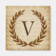 Ein zarter Lorbeerkranz ist auf einem Vintagen Notenhintergrund im klassisch römischen Stil geschichtet. Dieses Design ist personalisiert mit dem Monogramm "V" in einem reichen sienna Ton.