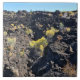 Ein heller und sonniger Morgen auf dem Weg auf der Lava Butte in der Nähe von Bend, Oregon, Teil des Newberry Volcano Systems. Auf der Spur des geschmolzenen Felsens geht man durch den Lavastrom von vor etwa 7.000 Jahren und sieht die Kaskadengipfel wie den Bachelor, Broken Top und die Drei Schwestern. Zwischen den Lavasteinen wachsen kühne und farbenfrohe Wildblumen. Foto nahm Sommer 2018.