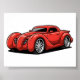 A lava red experimental hotrod with spiraled fenders. A striking cartoon design for fans of creative high energy car art.