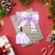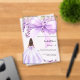 Ein heller, transparenter Hintergrund, mit einem großen Lavendel, lila Bogen, Wisteria-Blume, Schmetterlingen und einem Mädchen in einem Kleid dekoriert. Personalisieren und fügen Sie einen Namen und Party-Details hinzu.
