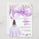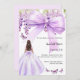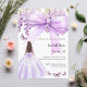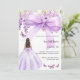 Ein eleganter weißer Hintergrund, mit einem großen Lavendel, lila Bogen, Wisteria-Blume, Schmetterlingen und einem Mädchen in einem Kleid dekoriert. Personalisieren und fügen Sie einen Namen und Party-Details hinzu.