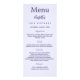 Geburtstagsmenü Karte. Personalisieren und fügen Sie einen Namen, Alter, Datum und das Menü. Ein Lavendel mit violettem Hintergrund. Lila Buchstaben. Zurück: Fügen Sie ein Foto des Geburtstagsmädchens hinzu, lustige Fakten.