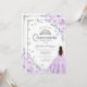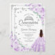 Lavender lila, silber und weiß Quinceanera Feier Einladung. Features brünettes Mädchen in Ballkleid, Skript-Schriftart, silberne Schmetterlinge, lila lila Rose und tiara. Ideal für eine elegante Glasfeier im Prinzessinnstil. Personalisieren Sie Ihre persönlichen Daten. Gedruckte Zazzle Einladungen oder Sofortdownload digitalen druckbaren Vorlage.
