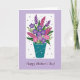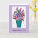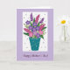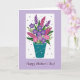 Diese Karte zeigt ein stilisiertes Blumenbouquet, das in einem weißen rechteckigen Rahmen auf einem weichen Lavendel-Hintergrund zentriert ist, was der Szene eine sanfte, liebevolle Atmosphäre verleiht ❤️. Die Blumen sind vereinfacht und grafisch dargestellt, wobei tiefe Indigo- und hellere Violett-Blütenblätter mit Fuchsien- und Magentablüten gemischt sind, umgeben von olivgrünen Blättern und dunklen Teel-Stielen. Einige Blüten weisen feine weiße radiale Linien auf, die eine zarte Blütenstruktur andeuten, während andere fedrig und voll aussehen, als ob sie sich in einer freundlichen Gruppe zueinander neigen. Das Bouquet sitzt in einer reichen Teel-Vase mit konischer Form und einem Ring aus winzigen weißen Punkten entlang des Rands sowie einigen kleinen weißen Kreisen, die auf dem Körper verstreut sind. Über den weiß gerahmten Bereich hinweg schweben kleine violette Punkte und Rauten wie Konfetti, was einen leichten feierlichen Touch hinzufügt 🌼. Unterhalb der Illustration erscheint eine kurze Nachricht, zentriert nahe dem unteren Rand, in einer schrägen, fließenden Schrift in einem dunklen Violett-Ton.