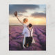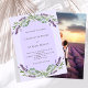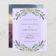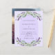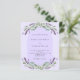 Ein violetter Hintergrund mit lila Lavendel-Blume, Eukalyptusgrün und einem Bogenrahmen. Personalisieren und Ihre Namen und Details. Zurück: Personalisieren Sie Ihr Foto und fügen Sie es hinzu. 1 Blatt = 1 Einladung mit Druckkante bis Kante.