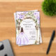 Ein klarer, transparenter Hintergrund. Ein großer Marmorbogen mit lavendelfarbenen, violetten Blumen. Ein Mädchen mit einem Lavendelkleid. Personalisieren und fügen Sie einen Namen und Details.
