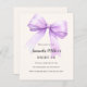 Ein beige, cremefarbener Hintergrund, mit einem großen Lavendel, violett und lila Bogen dekoriert. Personalisieren und fügen Sie einen Namen und Party-Details hinzu. 1 Blatt = 1 Einladung mit Druckkante bis Kante.