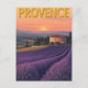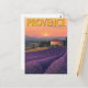Diese schöne Karte zeigt eine Vintage Abbildung der rollenden Lavendelfelder der Provence, Frankreich, bei Sonnenuntergang. Das Design vereint ein klassisches Gebäude aus Stein, eingebettet in die lebhaften lila Reihen mit Zypressen und Hügeln im Hintergrund. Das warme, goldene Stundenlicht und die Retro-Typografie verleihen ihm das Gefühl eines zeitlosen Reiseplakats. Es ist die perfekte Karte für eine Notiz von Ihren Reisen oder ein Geschenk für einen Natur- und Kunstliebhaber.