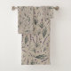 Bathroom towel set featuring a delicate lavender botanical pattern on a soft neutral background. Calm cottage style design with herbs and wildflowers that brings a gentle botanical touch to bathroom decor. Part of a coordinated lavender botanical collection with matching home decor and gift items.