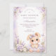 A sweet and whimsical baby shower design featuring an adorable bunny surrounded by soft lavender florals and delicate butterflies. The gentle watercolor palette of lilac, lavender, and soft greenery creates a dreamy nursery aesthetic with a light storybook feel. A tiny bow and tutu add an extra charming touch, making the design perfect for a soft, feminine celebration. Ideal for a lavender themed baby shower with a cute woodland-inspired atmosphere.