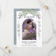Ein modernes und elegantes Save the Date für eine Hochzeit. Weiß mit Lavendel-Blume und Eukalyptusgrün dekoriert. Personalisieren und fügen Sie ein Datum, Foto und Ihre Namen. Der Text: Save the Date ist mit einem großen angesagten, handgeschriebenen Stilskript geschrieben. Zurück: grüner Hintergrund, Ihre Url zu Ihrer Hochzeitswebsite.