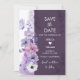 A romantic purple floral wedding save the date card featuring soft watercolor flowers in lavender, blush, and white, accented with delicate botanical line art and a graceful butterfly. The elegant vertical layout with a deep plum panel creates a refined and feminine look, making it perfect for announcing your wedding date in style. A beautiful choice for garden weddings, spring weddings, summer celebrations, and coordinated floral wedding stationery suites.
