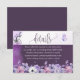 A romantic purple floral wedding details card featuring soft watercolor flowers in lavender, blush, and white, paired with delicate botanical line art and a graceful butterfly accent. The elegant layout combines a clean white upper section with a deep plum panel and a lush floral border along the bottom, creating a stylish and coordinated insert for sharing wedding information, venue directions, accommodations, RSVP notes, and reception details.