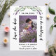 Eine moderne Hochzeit Save the Date Foto Karte. Mit Lavendelblumen, Blume und Eukalyptus-Pflanzen dekoriert. Personalisieren Sie Ihr Foto, Datum und Namen und fügen Sie diese hinzu. 1 Blatt = 1 Einladung mit Druckkante bis Kante.