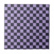 A vibrant checkered pattern with alternating black and lavender squares creates a bold, symmetrical grid. The design is balanced and visually striking.