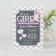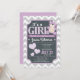 Niedlicher Lavendel lila und grauer Teddy mit Baby Dusche Einladung. Grauer und weißer Zickzack Musterhintergrund Es ist ein Mädchen!