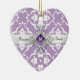 Ein Lavendel-Damast-Herz geformt Hochzeitsschmuck als ein Memento aus Ihrem besonderen Tag mit einem silbernen Band und grafische Darstellung eines Amethystjuwel. Personalisieren Sie Ihre Vorder- und Rückseite mit Ihrem Hochzeitstag, zusammen mit dem Namen von Groom und Bride.