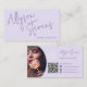 A modern and bold simple lavender and purple makeup artist and hair stylist business card featuring oversized name at the front in a handwritten style font and photo, qr code and social media at the back on black. All the colors are editable.