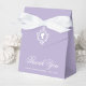 A lavender favor box for regency themed bridal shower. On the flap, it floral crest with a Regency lady profile silhouette in it.