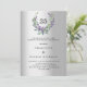 Ein Imitat silber aussehender Hintergrund. Ein Blumenkranz aus Lavendel-Blume und einem Aquarell aus Eukalyptusgrün. Personalisieren und fügen Sie Ihre Namen, Details. Schwarzer Text.