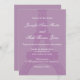 Diese elegante Pariser Einladung besticht durch einen Lavendelfarbenhintergrund mit einem subtilen lila Bild des Eiffelturms hinter Ihrem Text. Ihre Hochzeitseinladung ist weiß. Ein modernes, erstklassiges französisches Aussehen, das für jedes Paris-Thema oder jede Hochzeit in Urlaubsort perfekt ist.