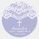 Lila Hintergrund mit einem schönen, Vintagen Spitzen-Aufkleber oder Umschlag Aufkleber der First Holy Communitymarke