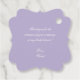 Ein elegantes Design mit einer Regency Lady in einem Vintagen Wappen, empfohlen für ein Regency-Brautparty. Das Wappen, die Dame will beiderseits den Text, der Hintergrund ist Lavendel (leicht lila). Unter dem Wappen befinden sich der Name und der Anlass in Kapseln, mit dem Datum darunter, in kleineren Kaps. Es gibt eine Dankeschön-Nachricht auf der Rückseite, geschrieben in einem kalligrafischen Skript. Empfohlen für einen Fan der Serie Jane Austen oder Bridgerton. Das Vintage Wappen mit Blumen ist Viktorianisch, aus einer alten Buchbinderei, aus dem Buch "Rust, Smut Mildew & Mold" aus dem Jahre 1870, jetzt im öffentlichen Bereich.