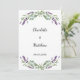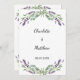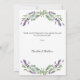 A white background, decorated with lavender, violet flowers and eucalyptus greenery.