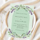Weiß grüner Hintergrund mit lila Lavendel-Blume, Eukalyptusgrün und Bogenrahmen. Personalisieren und Ihre Namen und Details. 1 Blatt = 1 Einladung mit Druckkante bis Kante.