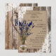 Rustikales Country Western Hochzeitskarte Design mit marineblavenblauen Lavendelbouquet in Maurerkirsche verpackt mit Burlap, Spitze, Zwirn und weiße Spitze über Leinen-Look Hintergrund und alten Holzplanken und eine Herz-Ätzung mit Monogramm auf der Rückseite.