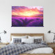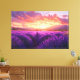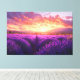 Ein atemberaubender Ausblick auf ein weitläufiges Lavendelfeld in der Provence, gebadet in den warmen Tönen einer untergehenden Sonne. Der Himmel ist in lebhaften Orange- und Rosatönen gestrichen und strahlt ein goldenes Licht über die sanfte Landschaft aus. Die duftenden lila Blüten ziehen sich endlos hin und schaffen eine ruhige und verträumte Landschaft.