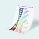 This flyer features a rainbow spiral of energy, representing Abraham-Hicks concept of the emotional guidance scale. All along the scale, in a rainbow serif font, are all the emotions on the scale: Love, Passion, Happiness, Positive Expectation, Optimism, Hopefulness, Contentment, Boredom, Pessimism, Frustration, Overwhelment, Disappointment, Doubt, Worry, Blame, Discouragement, Anger, Revenge, Rage, Jealousy, Guilt, and Fear. Art is on a white background.