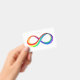 Helles Symbol der Unendlichkeit aus Plastikschichten rot, gelb, grün, türkis, blau und lila gesättigt Farben auf weißem Hintergrund.