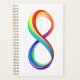 Helles Symbol der Unendlichkeit aus Plastikschichten rot, gelb, grün, türkis, blau und lila gesättigt Farben auf weißem Hintergrund.