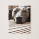 Ein atemberaubend schöner, flacher Glockenhund, der nach einem Tag müde aussieht. Er ist ein Whippet-Windhund Staffordshire Bull Terrier Cross.