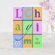 L'Chayim, To Life, Grüße für Pesach. Pesach-Grußkarte aus Papier. Farbenfrohe Kartenvorderseite mit verschiedenen Schriftart und leuchtenden Farben. Der Stern von David (Magen David) hängt vom Buchstaben "y" in der unteren links Ecke. "To Life" ist in der unteren rechten Ecke geschrieben. Bild und Vers Copyright © Shoaff Ballanger Studios.