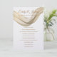 Diese Hochzeitseinladung wird in einem klassischen Layout auf weißem Hintergrund gezeigt, das in einem Papier mit Peal Shimmer Papier gezeigt wird. Wählen Sie Ihr Wunschpapier aus. Grafik des goldfarbenen Schleiers, der über die obere Vorderseite gezogen wurde. Coupels Namen vermischen sich mit der Schleiergrafik in einer goldenen Farbe oben. Text in goldener Farbe unter dem Schleierdrape. Passen Sie dieses Element an, indem Sie den Beispieltext nehmen und stattdessen Ihre Informationen darin einfügen. Bild auf Lager.