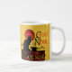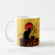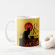 Kaffeetasse mit "Black Cat and Black Coffee" basierend auf Théophile Steinlens klassischen Plakaten. Dieses Design zeigt seine schwarze Katze, die auf einer Efeu-bedeckten Ziegelwand mit einer großen Tasse Kaffee sitzt. Aus der Kaffeetasse strömen Dampf und Herzen und im Hintergrund ein kräftig roter Vollmond.
