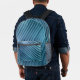 Das abstrakte Originalwerk von ZoeSPEAK, in Meeresblau auf diesem Rucksack, entstand aus einem originalen Nahaufnahme eines Bananenblattes. Die Diagonalen sind die Rippen des Blattes.