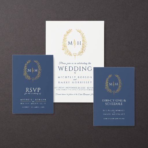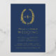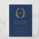 Leaf oval line Art Hochzeit Marine blau und Gold Einladung. Navy Blau und Gold von Hand gezeichnet wachsen Blatt ovale Kranz botanische Kunst Hochzeit Einladungen. Einfache Blattgestaltung, die Ihr eigenes Monogramm-Initialdesign umkreist. In klassisch dunkelblau und gold. Weitere Farben und passende Elemente sind verfügbar. © Original ovales Kranzblatt zeichn und Design von Sarah Trett für www.mylittleedenweddings.com auf Zazzle.