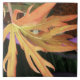 Das Kunstwerk auf dieser 6" Keramik Tile ist ein originales Nahaufnahmen von HomeWare eines Blattes auf einer jungen Pflanze der Korallen. Die Pflanze haben Blätter mit Palmat, deren Faltblätter mit Kanten versehen sind. Nach einer Farbverschiebung sieht das Blatt rötliches Gold aus. Die Blume-Töpfe sind lila geworden, alles vor dunkelbraunem und grünem Hintergrund.