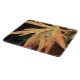 Das Kunstwerk auf diesem 6"x7" Glasschneidebrett ist ein originales Nahaufnahmen eines Blattes auf einer jungen Korallenhalle von HomeWare. Die Pflanze haben Blätter mit Palmat, deren Faltblätter mit Kanten versehen sind. Nach einer Farbverschiebung sieht das Blatt rötliches Gold aus. Die Blume-Töpfe sind lila geworden, alles vor dunkelbraunem und grünem Hintergrund.