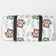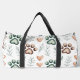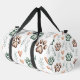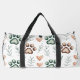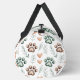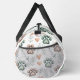 This cute design duffle bag features colored paw prints in brown and green, interwoven with leafy patterns and subtle heart design elements, all on a clean white background. It's a practical pet accessory and versatile carrier for travel and everyday use.